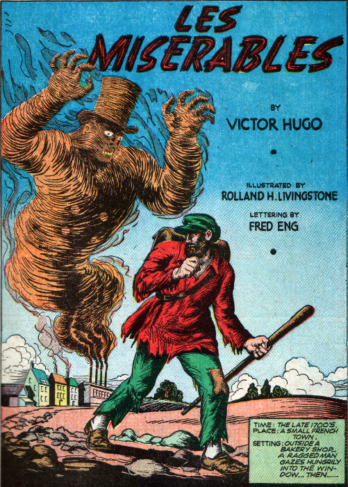 I can see that Rolland Livingstone’s art would look outdated a generation later, but from 70 years on, it’s a great example of Golden Age comic book art. I was caught right away by the splash page, in which factory smoke forms the spectral image of Inspector Javert. His art is detailed where it serves the story, sparse where it doesn’t, and never static.