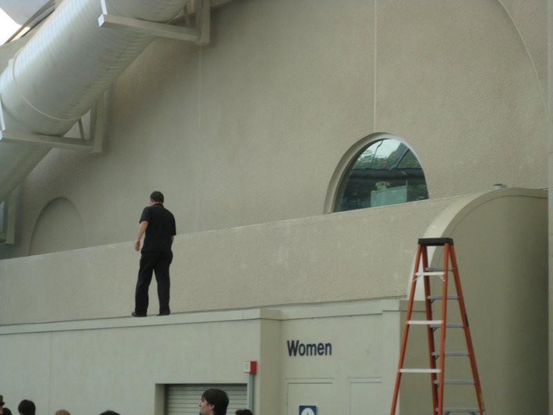 After climbing up the ladder, he made his way to the corner (where there were 2 wifi access points) and started picking up a coil of pale blue cable, so I assume he was doing something with the network.