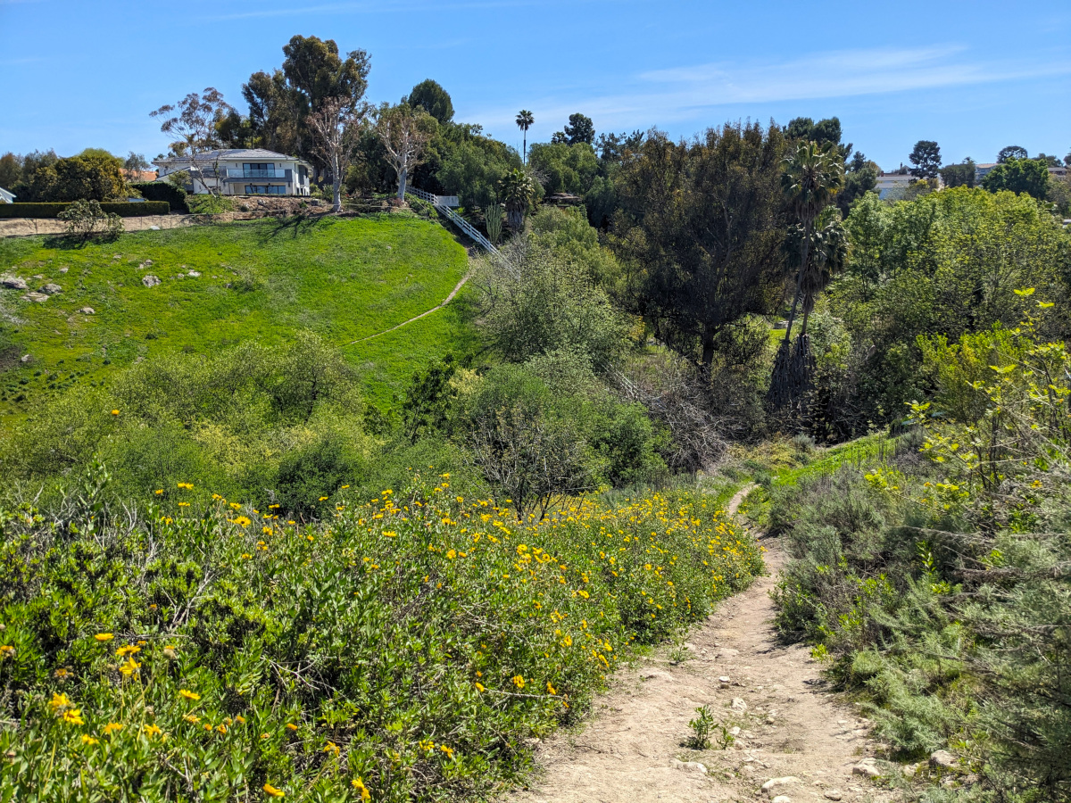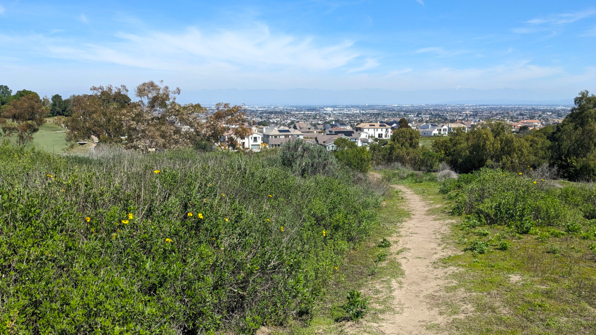Hilly, with not much shade except in the lightly wooded areas along the intermittent streambeds. The higher areas have clear views of the LA Basin to the north and east (Downtown LA to Saddleback), but mostly you can see the golf course it wraps around, a couple of Little League fields, and the suburban neighborhoods that surround it. Lots of up and down, mostly scrub habitat with some grassy areas.